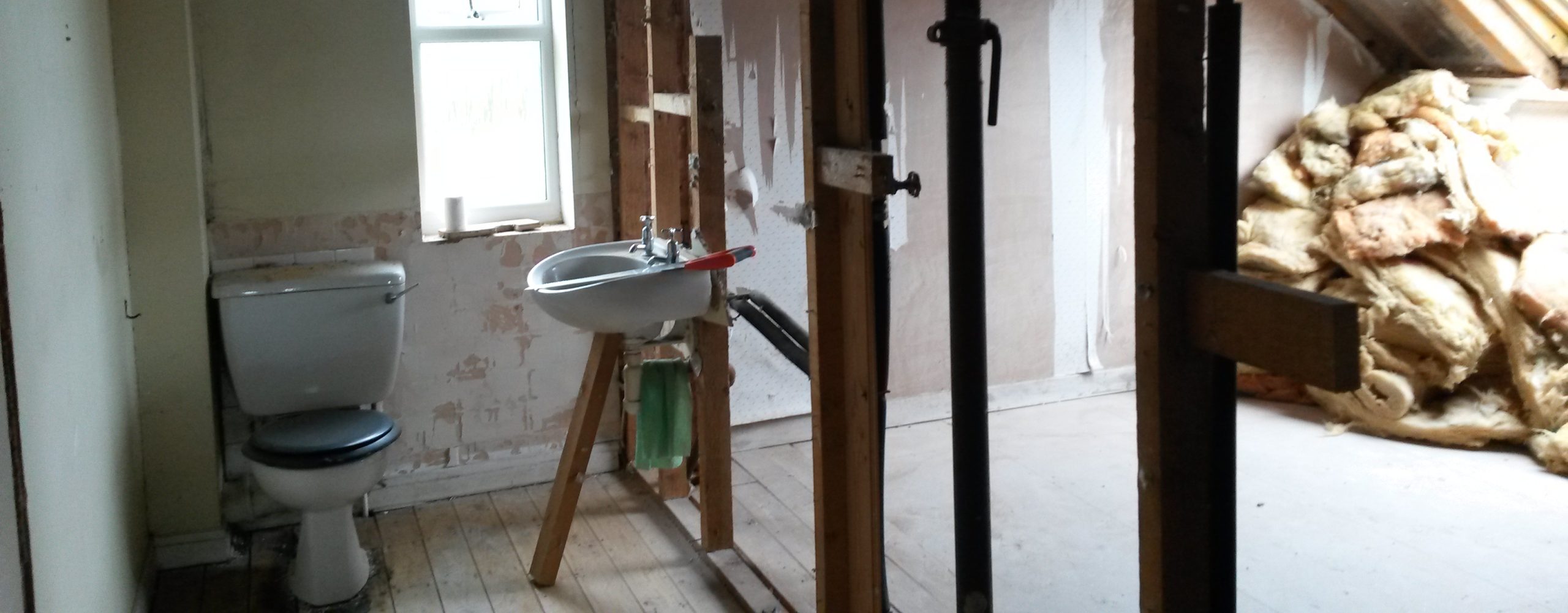 … to make an omelette. Work progresses on our site in Lympstone, remodelling and refurbishing almost every room of this home and extending into the loft space. We will be re-building the walls to the bathroom, for a little privacy, in due course but first existing finishes are stripped out to allow floors and roofs to be strengthened, insulation to be added, and services to be threaded through the existing structure. Careful planning of the works has taken place to ensure that at least one bathroom is functioning (and private!) at any one time, so the work is phased for rotational occupation by the client, who is in residence.