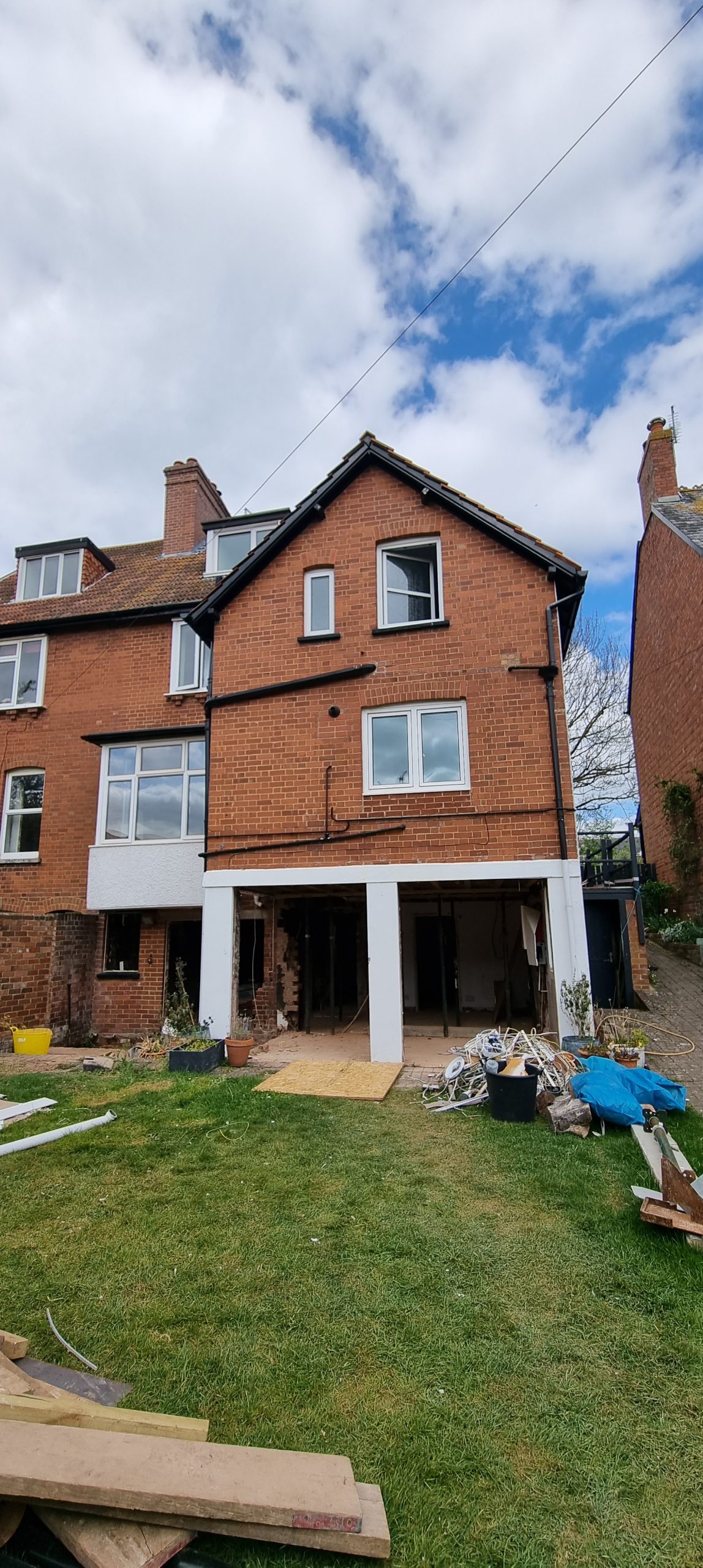 This was a complicated project disrupting much of the house; as you can see from the photos the rear of the house was open to allow significant structural intervention, to make much of the living space open-plan, and open up the rear to views and light. Whilst many more modest projects can be managed with the client living in-situ, in this case it made sense to move out and give the contractor wider access to the whole of the site. The scope included remodelling and/or remedial works to every room in the house.